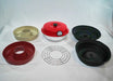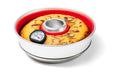 A circular aluminium food container with center hole sits on a matching stainless steel base that is placed over the heat source. The heat spreads along the bottom of the food container and as it rises the specially designed lid with ventilation hole diverts the heat over the top of the container.