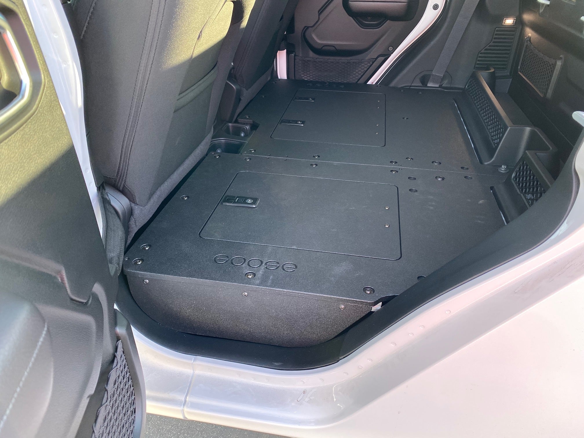 Jeep Gladiator Second Row Seat Delete Plate System is available for the 2019-Present Gladiator truck in a 60% Passenger Side or in a 40% Driver’s Side version. Both can be combined to create a 100% second row seat delete. Insert nuts in the platforms provide points for anchors (available separately) to secure your storage and gear including dog crates, fridges, coolers, etc.