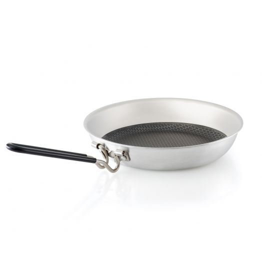The Gourmet Frypan features a raised laser-etched stainless steel grid that protects the nonstick surface from utensil damage. The Frypan offers excellent food release, easy cleanup, and GSI's SureLock folding handle, which provides a sturdy, stable grip over the stovetop or grill and conveniently folds into the pan for storage and transport. The heavy-gauge, clad aluminum core, keeps the frypans lightweight and quick to heat over any heat source, just like the finest gourmet pans.