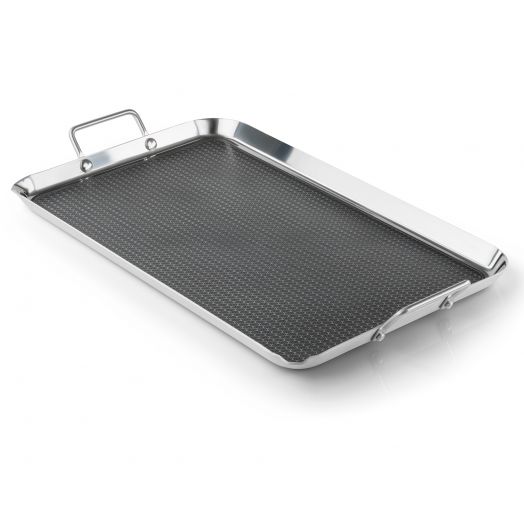 Cook up a mess of flapjacks and bacon for your hungry campers with this rugged yet easy-to-clean two-burner-stove griddle. Unique and durable, stainless steel stove top camping griddle incorporates thick, heat-conductive aluminum base clad to durable 304/18-8 stainless steel top with recessed, laser-etched pockets of Teflon non-stick coating. The combination reduces hot spots and increases scratch resistance, especially when using metal chef’s tools. Designed for use on two or three-burner propane stoves. Handles make it easy to lift, move and store.