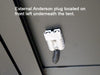 • External 50 amp Anderson plug mounted to underside of tent for connection to vehicles power.