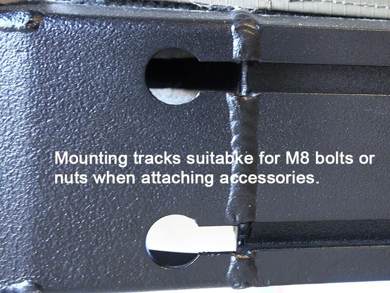 • Two heavy duty 20mm (0.08″ high) aluminum extruded foot rails underneath tent with M8 slots on sides and base for easy mounting, set 1050mm / 41.34″ apart centre to centres joined by multiple 25mm thick sections of welded box tubing for additional strength and floor support.