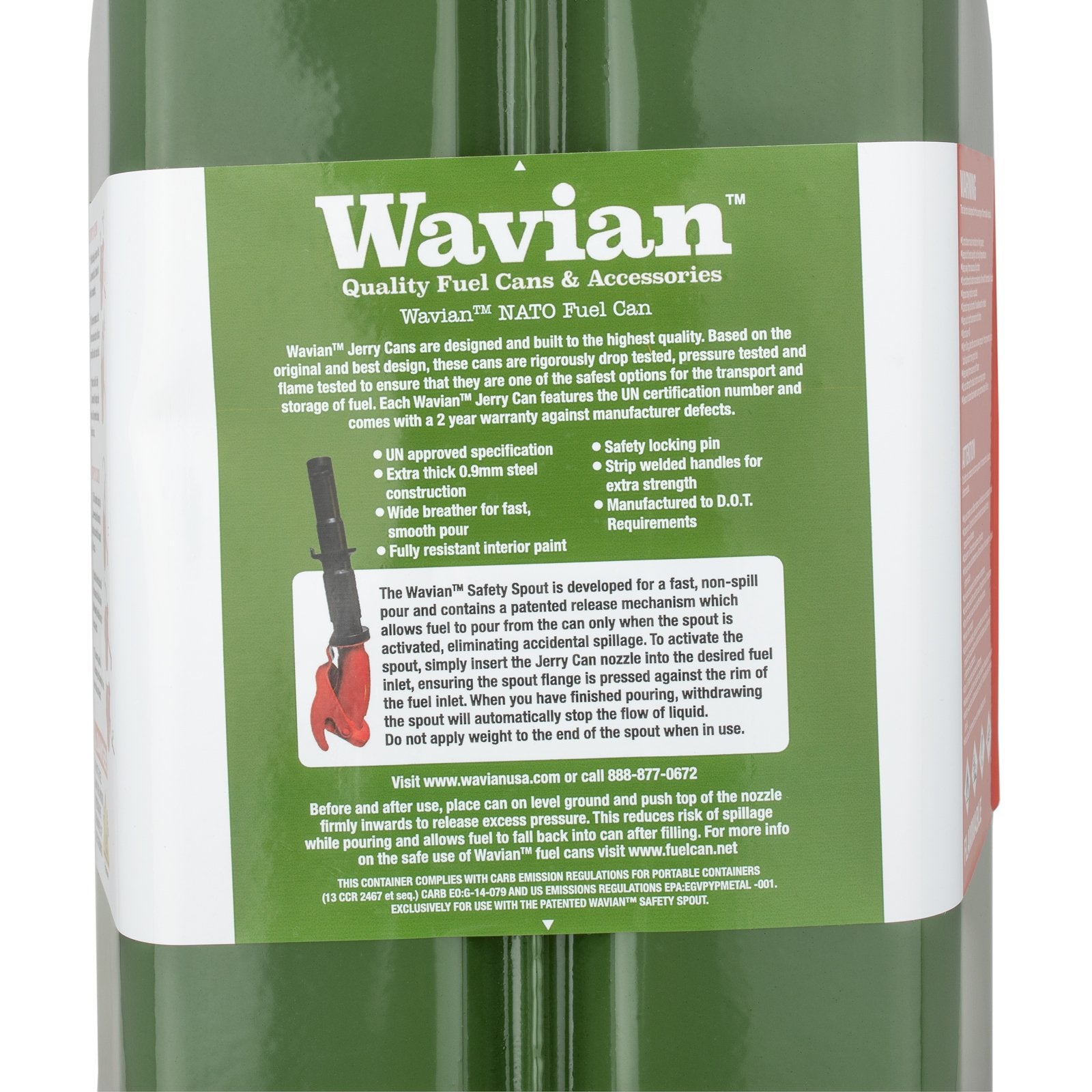 These leak-proof steel fuel cans come directly from Wavian, the factory that has supplied many NATO countries for over 75 years, and are the highest quality jerry cans on the market today. Rigorously tested, they boast a number of features, including 0.9 mm steel walls, an interior rust-proof Rezol lining, an internal breather pipe for splash-proof pouring, a three handle configuration for easy carrying, a Leak-proof bayonet closure, and a locking pin for the cap. Wavian currently produces the only EPA, CARB, and DOT approved steel fuel cans that are 100% legal in all 50 US states. Includes spout and an adapter for vehicles with smaller filler receivers.