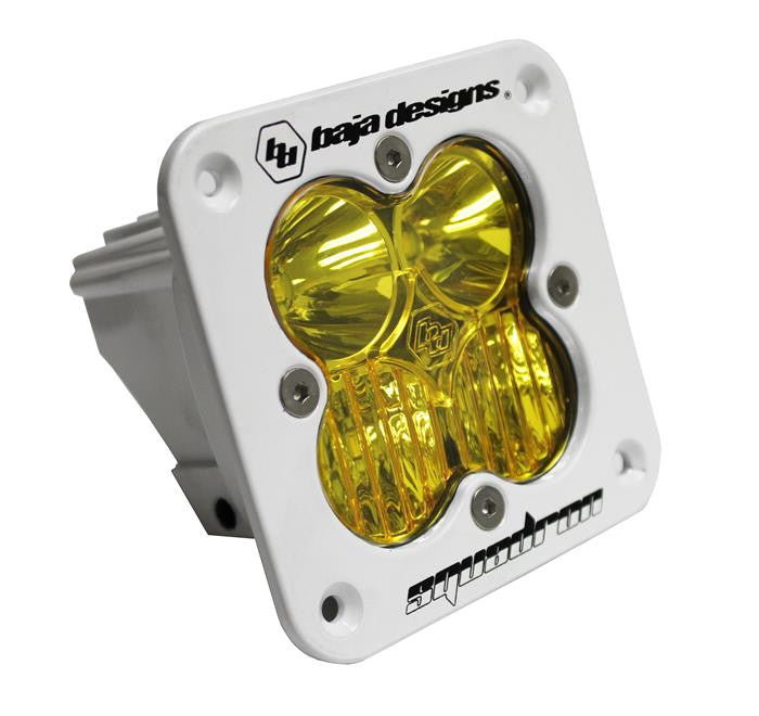 Our Squadron Pro packs 4,900 Lumens at 42 watts that will truly annihilate the night. Dont let this light fool you, although compact in size this LED auxiliary light will literally blind you with brightness. The Pro comes equipped with a sleek black gloss aluminum housing and outshines the competition through both appearance and performance. An industry first 30 Day Satisfaction Guarantee Limited Lifetime Warranty is included for the ultimate in purchase protection.Baja Designs Features: Satisfactions Guarantee 30 Day Money Back Guarantee Limited Lifetime Warranty Complete Purchase Protection uService Replaceable Lenses And Optics ClearView All The Light, Right Where You Need It. MoistureBlock Waterproof, Rain Proof, Submersible CopperDrive Only LED Driven At 100% 5000K Daylight Less Driver Fatigue, Natural ColorSpecifications: Lumens:4,900 Utilizing 4 Cree LEDs Wattage/Amps:42W / 3.5A Dimensions:3.50" x 2.77" x 3.50" Weight:12 ounces LED Life Expectancy:49,930 Hours Front Lens:Hard Coated Polycarbonate Housing:Hard Anodized Powder Coated Cast Aluminum Bezel:Billet Machined Aluminum Hardware Bracket Material:Stainless Steel Exceeds MIL-STD810G (Mil-Spec Testing) Built-In Overvoltage Protection IP69K (Waterproof, Submersible to 9ft) IK10 Compliant (Mechanical Impact Testing) Includes:Squadron Pro Flush Mount LED Light, WhiteMounting Bracket Patterns: Driving/Combo: Maximum trail coverage in a single light. The Driving/Combo pattern is equipped with both Driving (10Á) and Spot (9Á) optics to provide you with a smooth blend of light for both near field applications and distance (Lighting Zone 3) Wide Cornering:BD was the first to develop a pattern specifically for cornering, dust and/or fog conditions. The Wide Driving pattern offers a 42Á flattened horizontal beam for the ultimate in comfort lighting. (Lighting Zones 1 2) Spot:A longer and narrower 9Á beam focus for illumination further down the trail or road. The Spot pattern is designed to be used in conjunction with additional Wide Driving and/or Driving/Combo beam lights. (Lighting Zone 4 5) Flood:Excellent work light or scene light with an extremely smooth 60Á circle that projects about 60 ft). This pattern is not suitable for driving. (Lighting Zone 7)