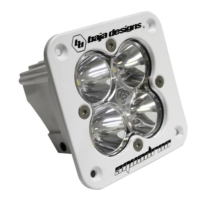 Our Squadron Pro packs 4,900 Lumens at 42 watts that will truly annihilate the night. Dont let this light fool you, although compact in size this LED auxiliary light will literally blind you with brightness. The Pro comes equipped with a sleek black gloss aluminum housing and outshines the competition through both appearance and performance. An industry first 30 Day Satisfaction Guarantee Limited Lifetime Warranty is included for the ultimate in purchase protection. Baja Designs Features: Satisfactions Guarantee 30 Day Money Back Guarantee Limited Lifetime Warranty Complete Purchase Protection uService Replaceable Lenses And Optics ClearView All The Light, Right Where You Need It. MoistureBlock Waterproof, Rain Proof, Submersible CopperDrive Only LED Driven At 100% 5000K Daylight Less Driver Fatigue, Natural ColorSpecifications: Lumens:4,900 Utilizing 4 Cree LEDs Wattage/Amps:42W / 3.5A Dimensions:3.50" x 2.77" x 3.50" Weight:12 ounces LED Life Expectancy:49,930 Hours Front Lens:Hard Coated Polycarbonate Housing:Hard Anodized Powder Coated Cast Aluminum Bezel:Billet Machined Aluminum Hardware Bracket Material:Stainless Steel Exceeds MIL-STD810G (Mil-Spec Testing) Built-In Overvoltage Protection IP69K (Waterproof, Submersible to 9ft) IK10 Compliant (Mechanical Impact Testing) Includes:Squadron Pro Flush Mount LED Light, WhiteMounting Bracket Patterns: Driving/Combo: Maximum trail coverage in a single light. The Driving/Combo pattern is equipped with both Driving (10Á) and Spot (9Á) optics to provide you with a smooth blend of light for both near field applications and distance (Lighting Zone 3) Wide Cornering:BD was the first to develop a pattern specifically for cornering, dust and/or fog conditions. The Wide Driving pattern offers a 42Á flattened horizontal beam for the ultimate in comfort lighting. (Lighting Zones 1 2) Spot:A longer and narrower 9Á beam focus for illumination further down the trail or road. The Spot pattern is designed to be used in conjunction with additional Wide Driving and/or Driving/Combo beam lights. (Lighting Zone 4 5) Flood:Excellent work light or scene light with an extremely smooth 60Á circle that projects about 60 ft). This pattern is not suitable for driving. (Lighting Zone 7)